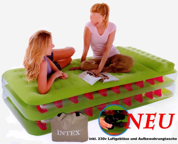 Produktbeschreibung Artikelmerkmale Intex Luftbett „Take Along“ Nr.67716 Produkthighlight 2011 Bringen Sie Farbe in Ihre Wohnräume. Dieses frische und farbenfrohe Design ist perfekt für Überraschungsgäste oder Schulausflüge. Durch die grüne beflockte Oberfläche und die pinken Träger passt dieses dynamische Luftbett perfekt zum Lifestyle der Young Generation. Auffalten. Ausblasen und in wenigen Minuten steht das Bett zur Benutzung bereit. – qualitätsgeprüfte. wasserfeste. beflockte Oberfläche – komfortable Liegefläche mit eingebautem Kissen – doppellagige. spulen-förmige Träger Konstruktion für extra Stabilität – inkl. Transporttasche Technische Details: – Grundgröße 191 x 99 x47cm – Matratzenhöhe 38cm – inkl. separate tragbare Luftpumpe: 230 V